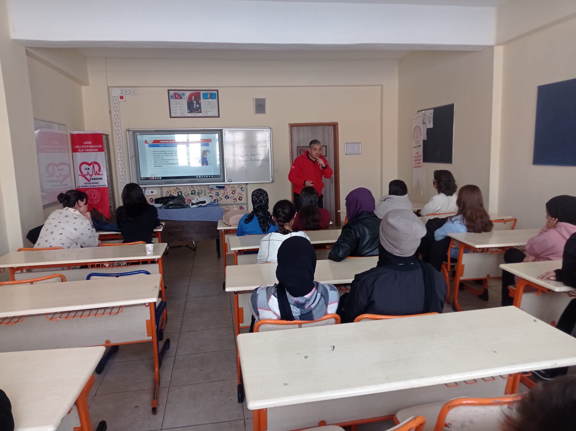Ağrı İl Milli Eğitim Müdürlüğü İlk Yardım Eğitim Merkezi eğitmenleri tarafından Genç MEB-AKUB üyelerine İlk Yardım Semineri ve Afet Farkındalık Eğitimi verildi. İl Milli Eğitim Müdürü Hasan KÖKREK, "bu eğitimler neticesinde Afetler ve İlk Yardım konusunda daha bilinçli bir nesil yetişiyor. Acil durumlarla karşılaştığımızda ne yapılması gerektiği hakkında bilgi edinip gerektiğinde hayatlara dokunabiliriz." Dedi.